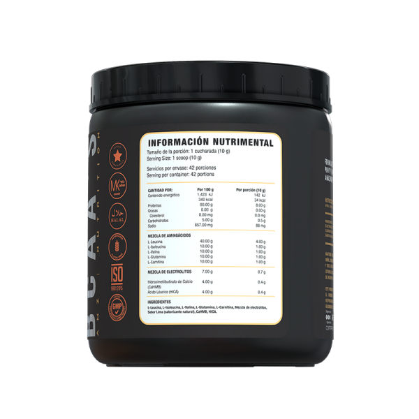 Proteínas 8 g - L- Leucina 4g - L-Isoleucina 1g - L-Valina 1g - L-Glutamina 1g - L-Carnitina 1g - Mezcla de Electrolitos (CaHMB y HICA) 0.7g